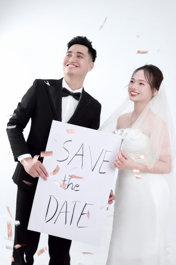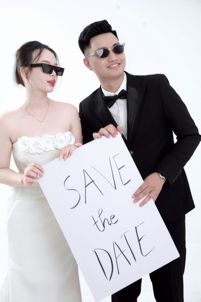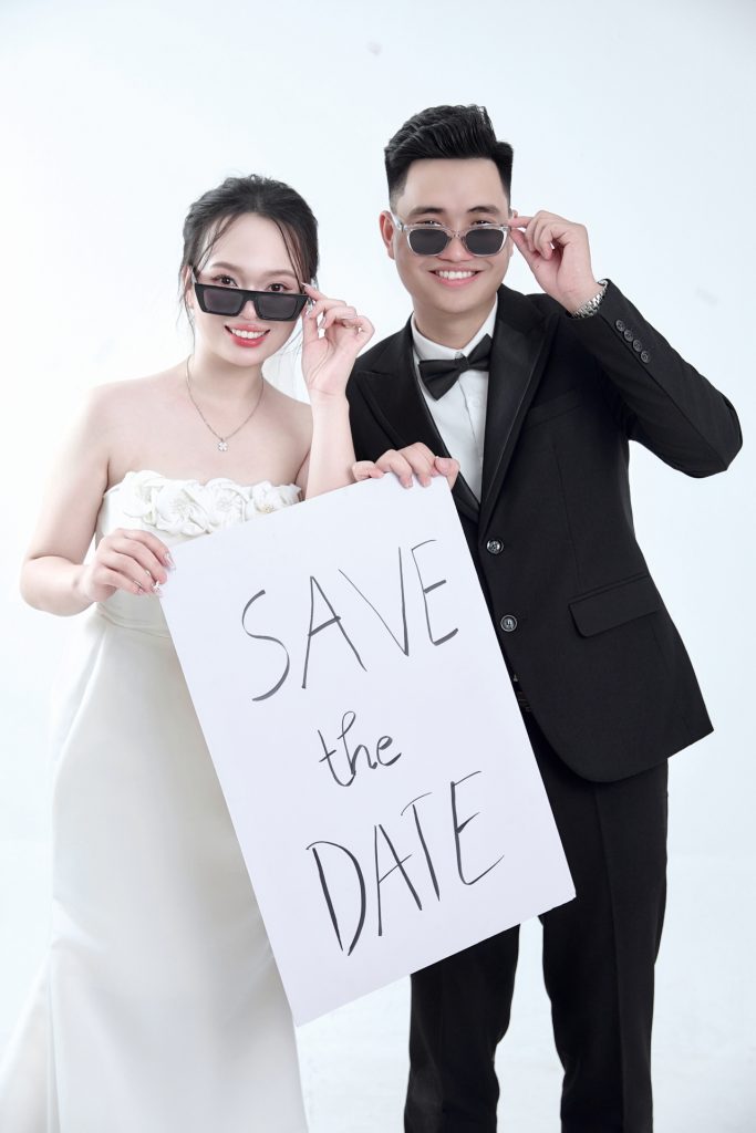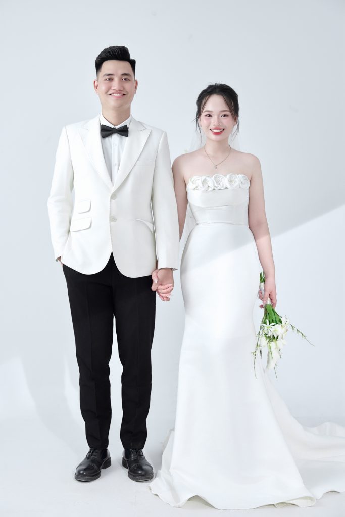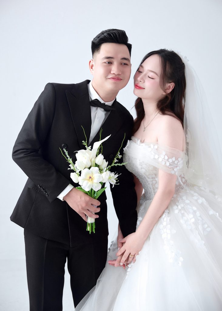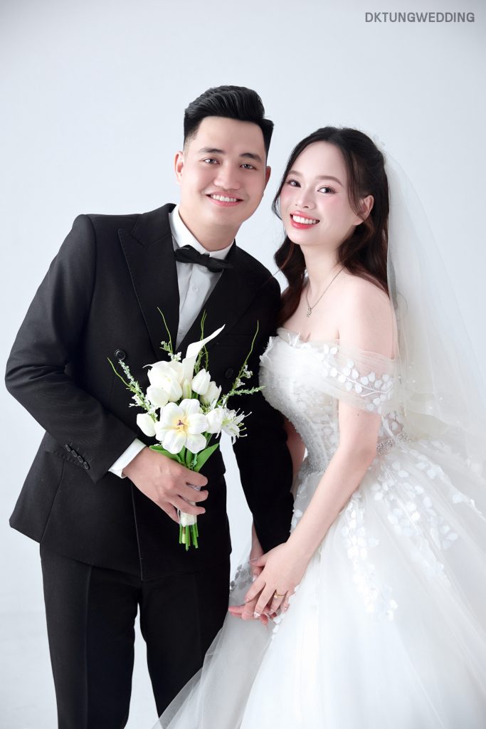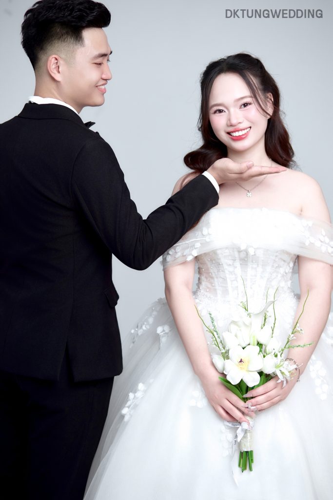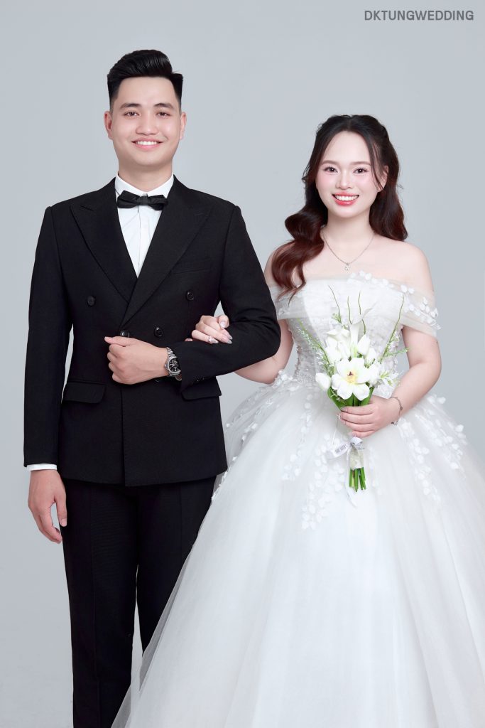 Concept 1 : Chú rể lịch lãm với vest đen cổ điển, còn cô dâu xinh đẹp lộng lẫy trong chiếc váy cưới trễ vai tinh khôi. Ánh sáng studio mềm mại nhưng vẫn làm nổi bật cảm xúc. Đặc biệt, cử chỉ tạo dáng ngọt ngào đáng yêu của cô dâu cùng hoa trắng tinh tế đã tạo nên một bức ảnh đầy hạnh phúc và vô cùng lãng mạn.