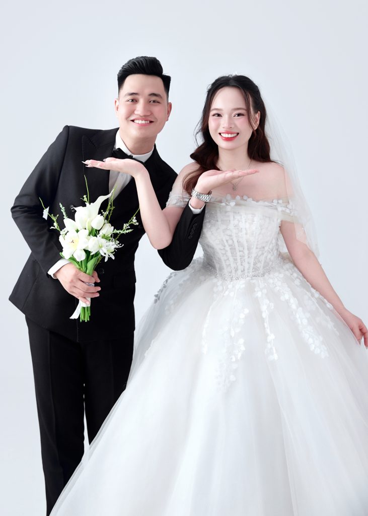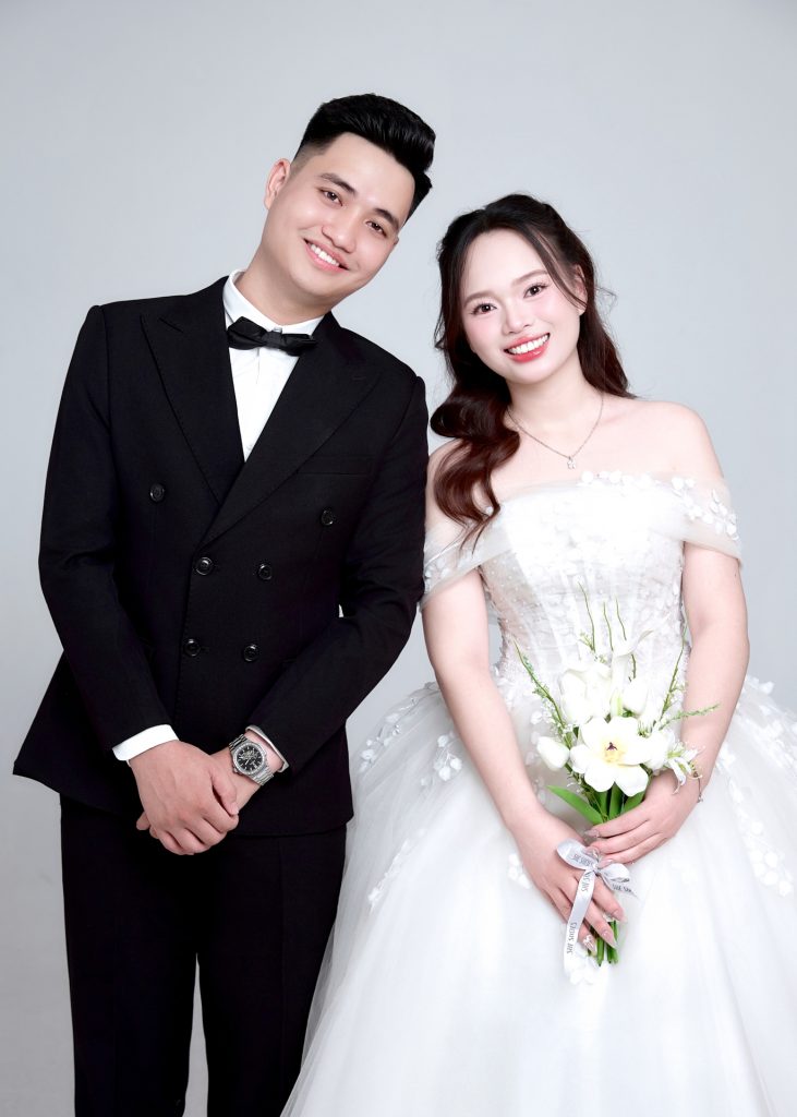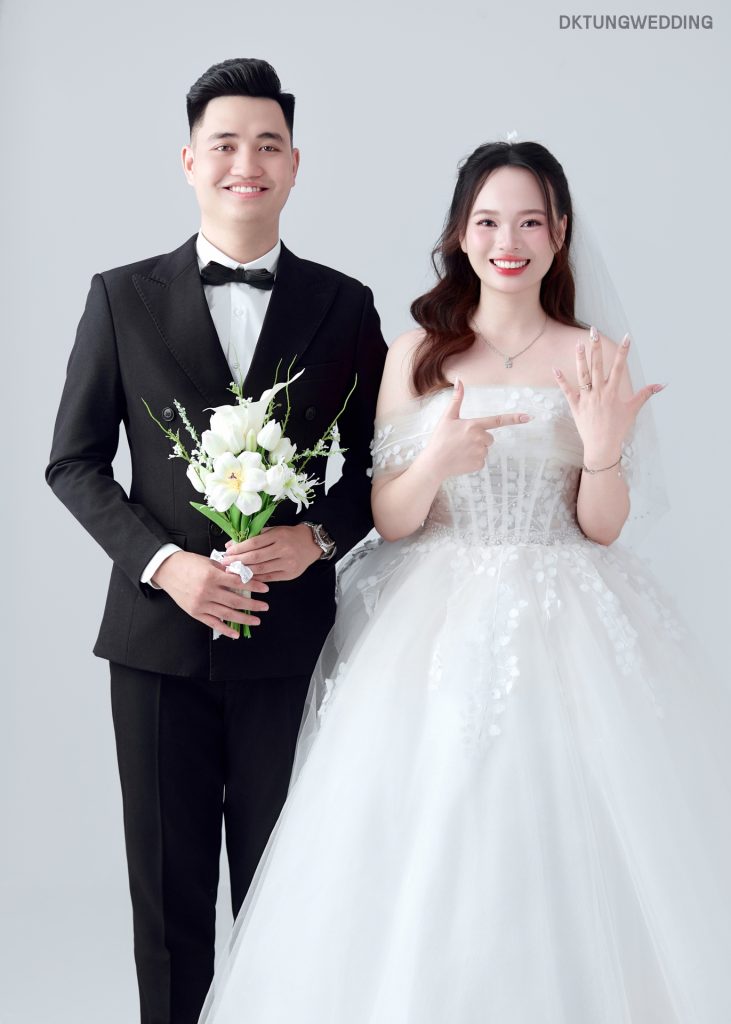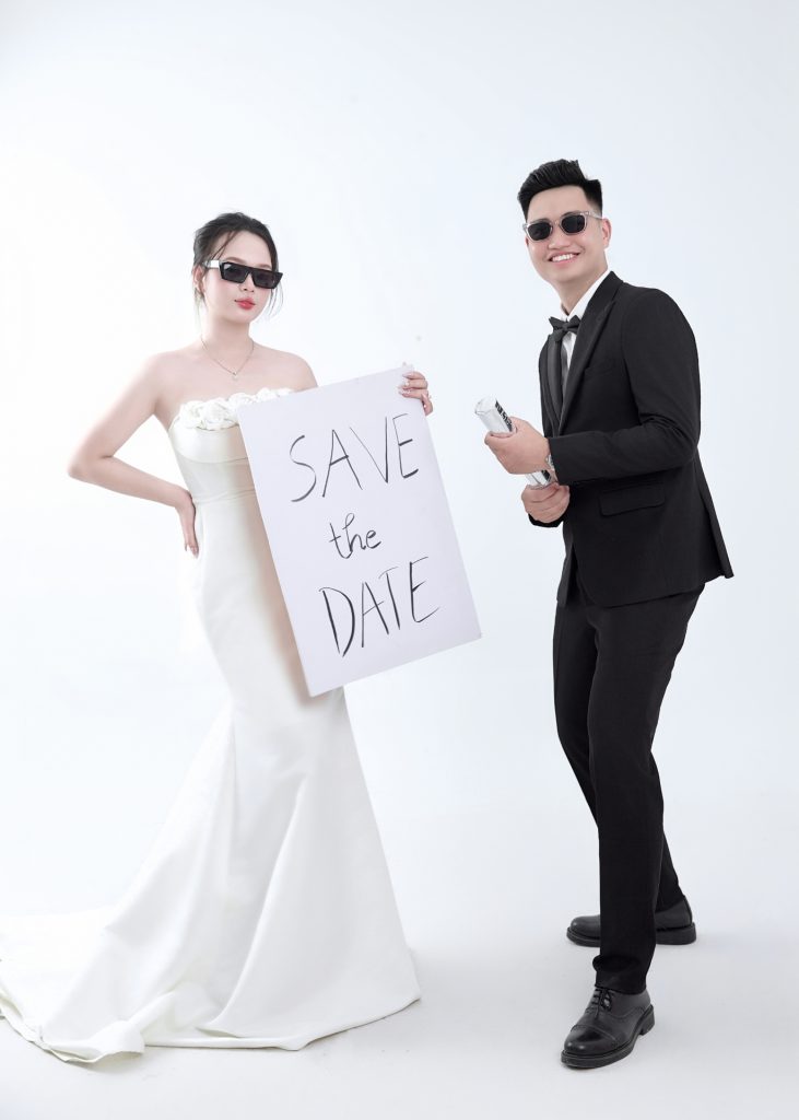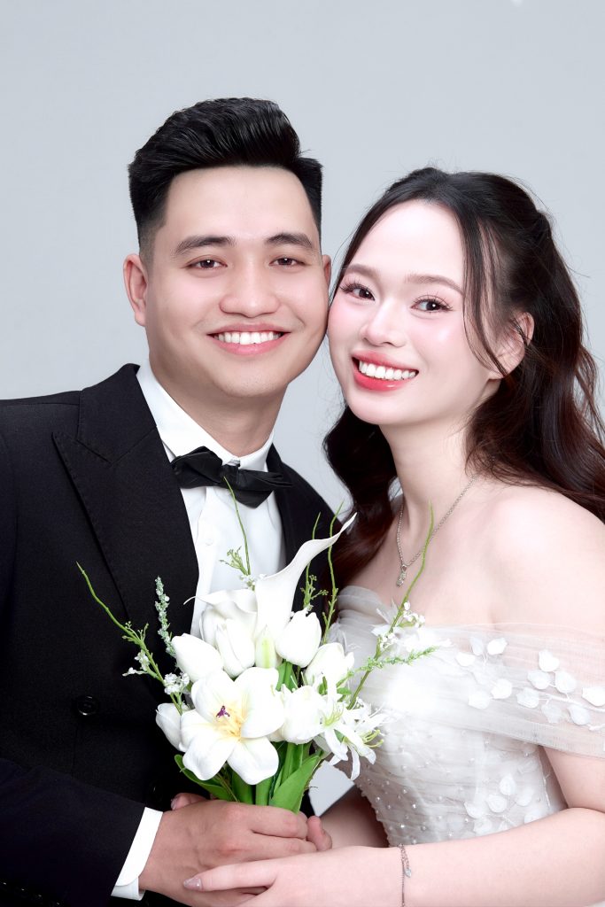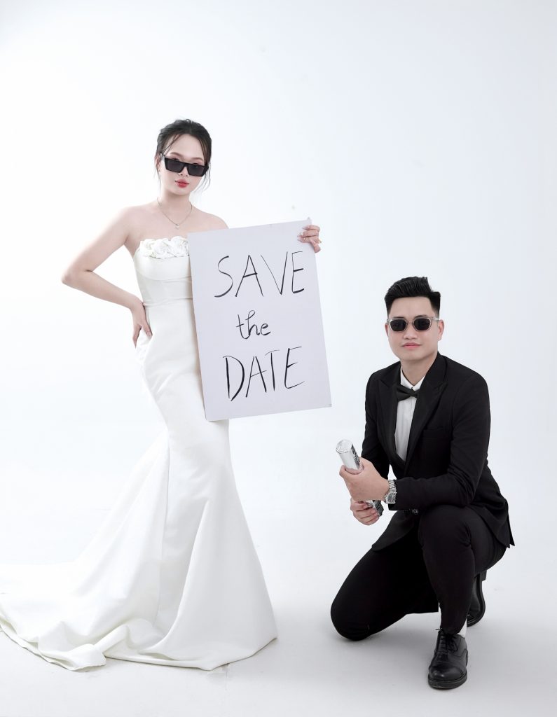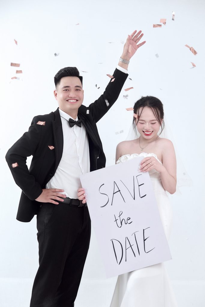 Concept 1 : Chú rể lịch lãm với vest đen cổ điển, còn cô dâu xinh đẹp lộng lẫy trong chiếc váy cưới trễ vai tinh khôi. Ánh sáng studio mềm mại nhưng vẫn làm nổi bật cảm xúc. Đặc biệt, cử chỉ tạo dáng ngọt ngào đáng yêu của cô dâu cùng hoa trắng tinh tế đã tạo nên một bức ảnh đầy hạnh phúc và vô cùng lãng mạn.