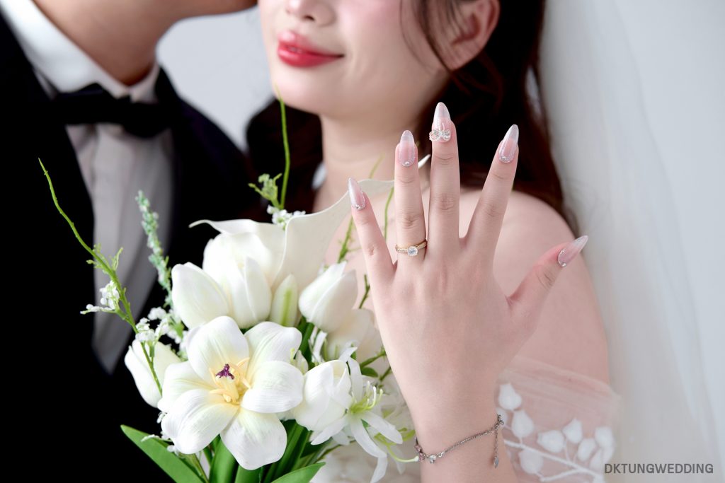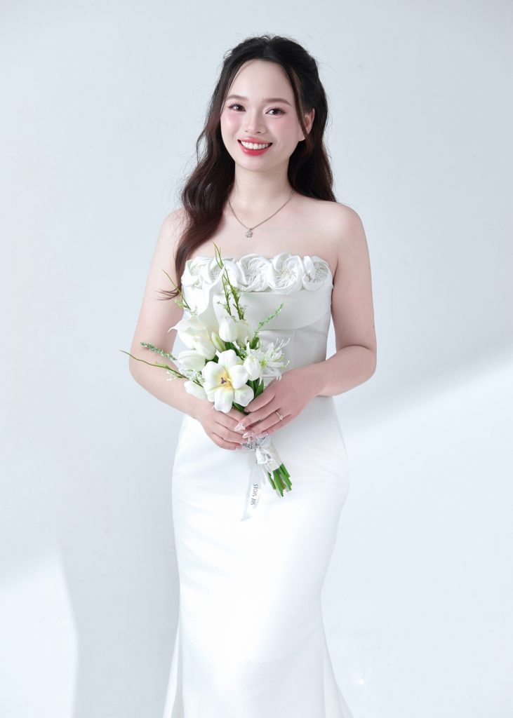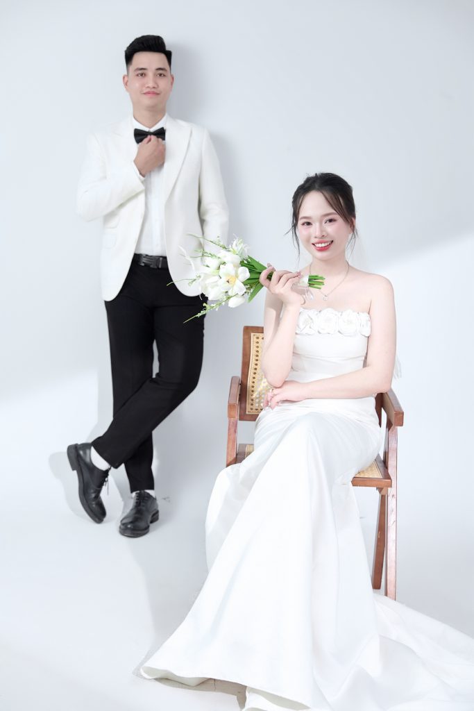 Concept 2 : Chọn váy cưới đuôi cá màu trắng tinh khôi, tôn lên đường cong cơ thể. Thiết kế cúp ngực tạo sự gợi cảm vừa phải. Bó hoa tulip trắng tiếp tục củng cố chủ đề thuần khiết. Chú rể kết hợp Vest trắng cùng quần tây đen tạo nên sự đối lập màu sắc nổi bật, hiện đại và rất “thời trang”, khác biệt so với vest đen truyền thống. Ánh sáng studio được bố trí mềm mại , đôi khi có tạo bóng đổ nhẹ ở góc để tăng chiều sâu mà vẫn giữ được sự tinh khiết, sạch sẽ của bức ảnh.